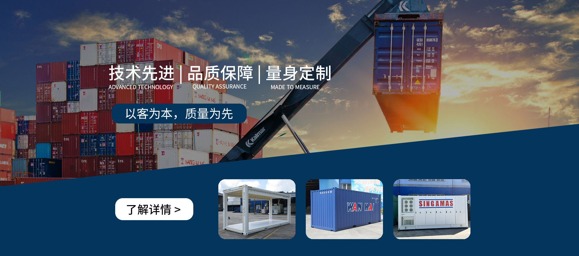 公司位于同安工業(yè)集中區(qū),占地150多畝,注冊(cè)資本2300萬(wàn)美元,員工近1000名,擁有五十三多項(xiàng)技術(shù)專(zhuān)利,建有標(biāo)準(zhǔn)箱和定制箱生產(chǎn)線(xiàn)及專(zhuān)用集成車(chē)間,單班年產(chǎn)能可達(dá)十五萬(wàn)標(biāo)準(zhǔn)箱。憑借自身合理完善的運(yùn)營(yíng)機(jī)制,公司除獲得包括中國(guó)船級(jí)社在內(nèi)的國(guó)際各大船級(jí)社的認(rèn)證外,還通過(guò)了ISO質(zhì)量管理體系和環(huán)境管理體系認(rèn)證......