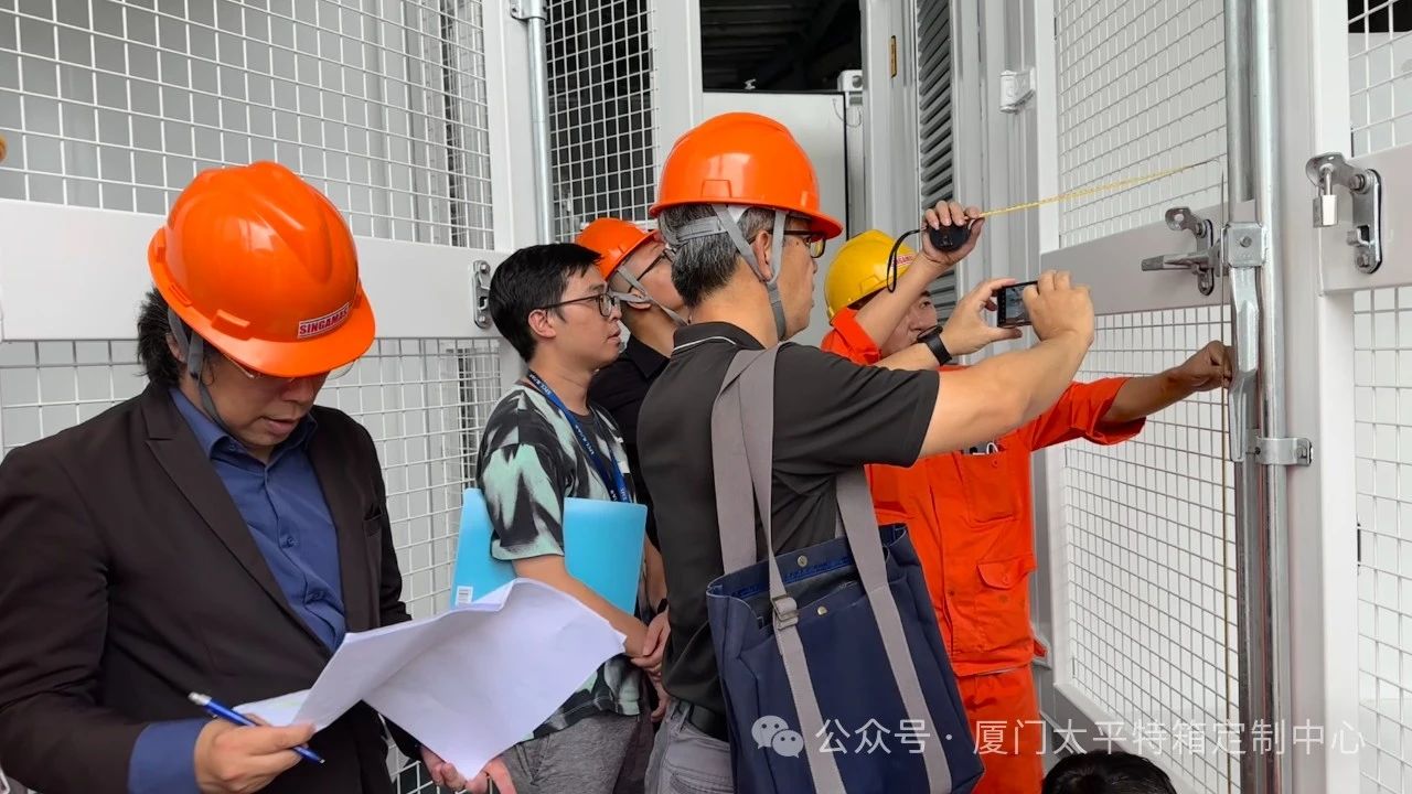 在驗(yàn)收現(xiàn)場(chǎng),客戶代表對(duì)我司產(chǎn)品進(jìn)行了全面細(xì)致的檢查,從外觀美觀度、箱體材質(zhì)及焊接工藝、機(jī)柜設(shè)備安裝預(yù)制位到防腐防水等多項(xiàng)產(chǎn)品功能逐一核驗(yàn)。廈門太平以專業(yè)的研發(fā)設(shè)計(jì)、行業(yè)一流的生產(chǎn)工藝、嚴(yán)格的全流程質(zhì)量把控和高效的團(tuán)隊(duì)協(xié)作,贏得了客戶的高度贊譽(yù)。